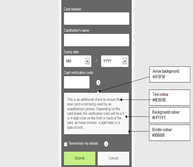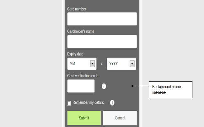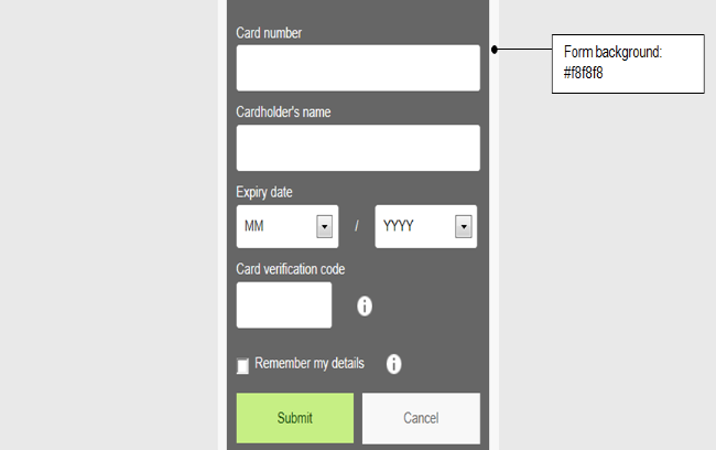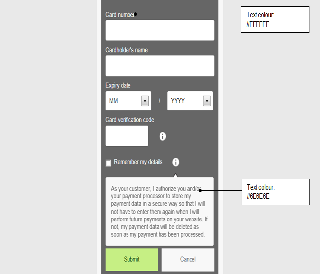 È possibile reindirizzare a (o includere in) un IFrame il FlexCheckout in cui il titolare della carta inserirà i dati della carta nel sistema. I dati della carta, insieme al codice CVC, vengono conservati in modo sicuro ma soltanto per un periodo di tempo limitato. Per salvare i dati della carta in modo permanente, è possibile contrassegnare l'alias come alias "Persistent" (permanente). Tuttavia, in conformità con gli standard di sicurezza PCI, i codici CVC possono essere memorizzati per due ore al massimo.
