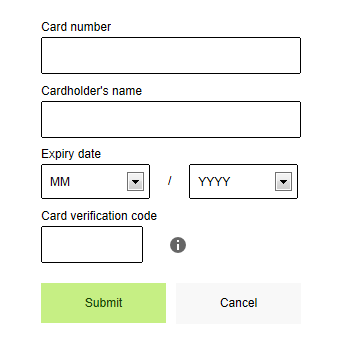 - FlexCheckout: la FlexCheckout viene reindirizzata a un iframe o inclusa al suo interno, quindi il titolare della carta inserisce i dati della carta nel nostro sistema, dove vengono memorizzati in modo sicuro (compreso il CVC, ma solo per un periodo limitato)